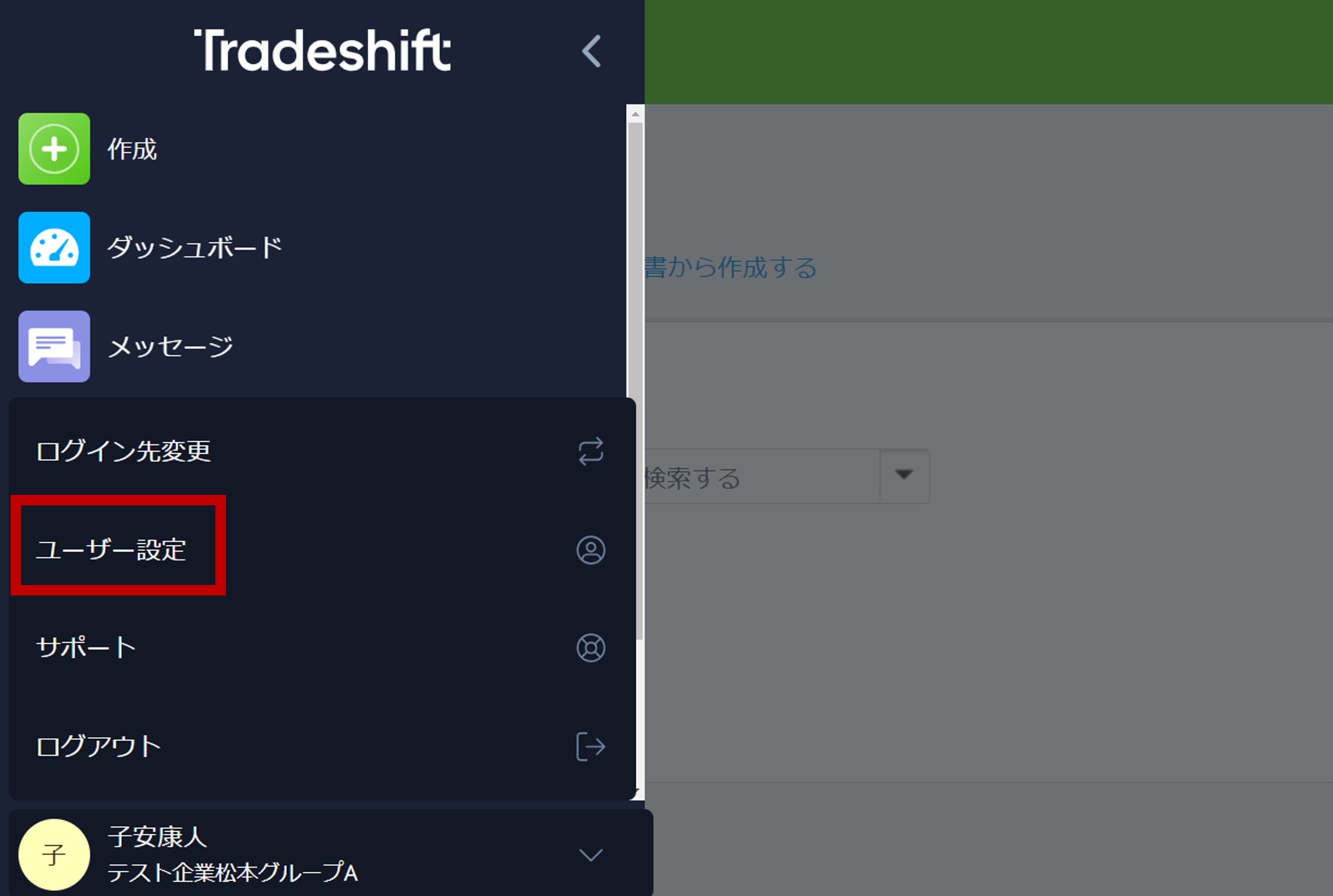 1.メニューバー下部のユーザーの名前を押下し、[ユーザー設定]を押下