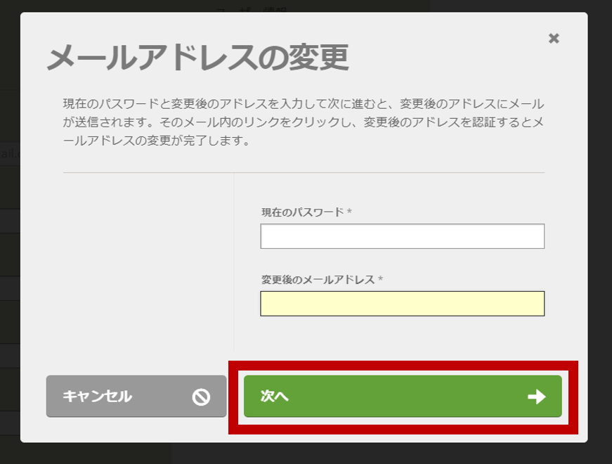 3.現在のパスワードと変更後のメールアドレスを入力し、次へを押下
