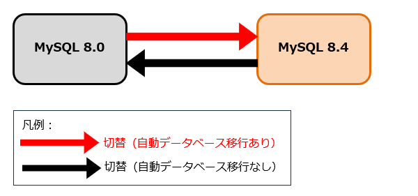 ・MySQL8.4 → MySQL8.0への切り戻しでは自動でデータベースは引き継がれません。
