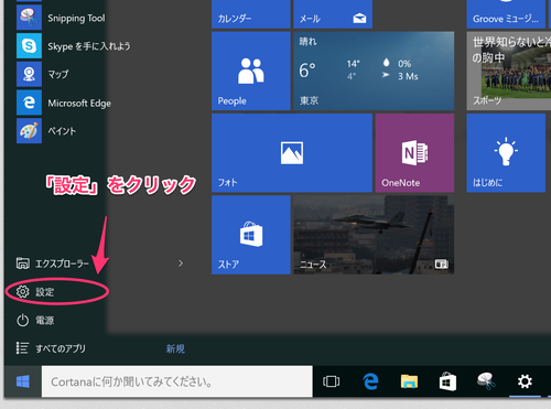 (1)デスクトップ画面左下のWindowsボタンから、「設定」をクリック。