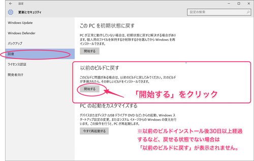 (3)「更新とセキュリティ」画面左側から「回復」を選択し、「以前のビルドに戻す」または